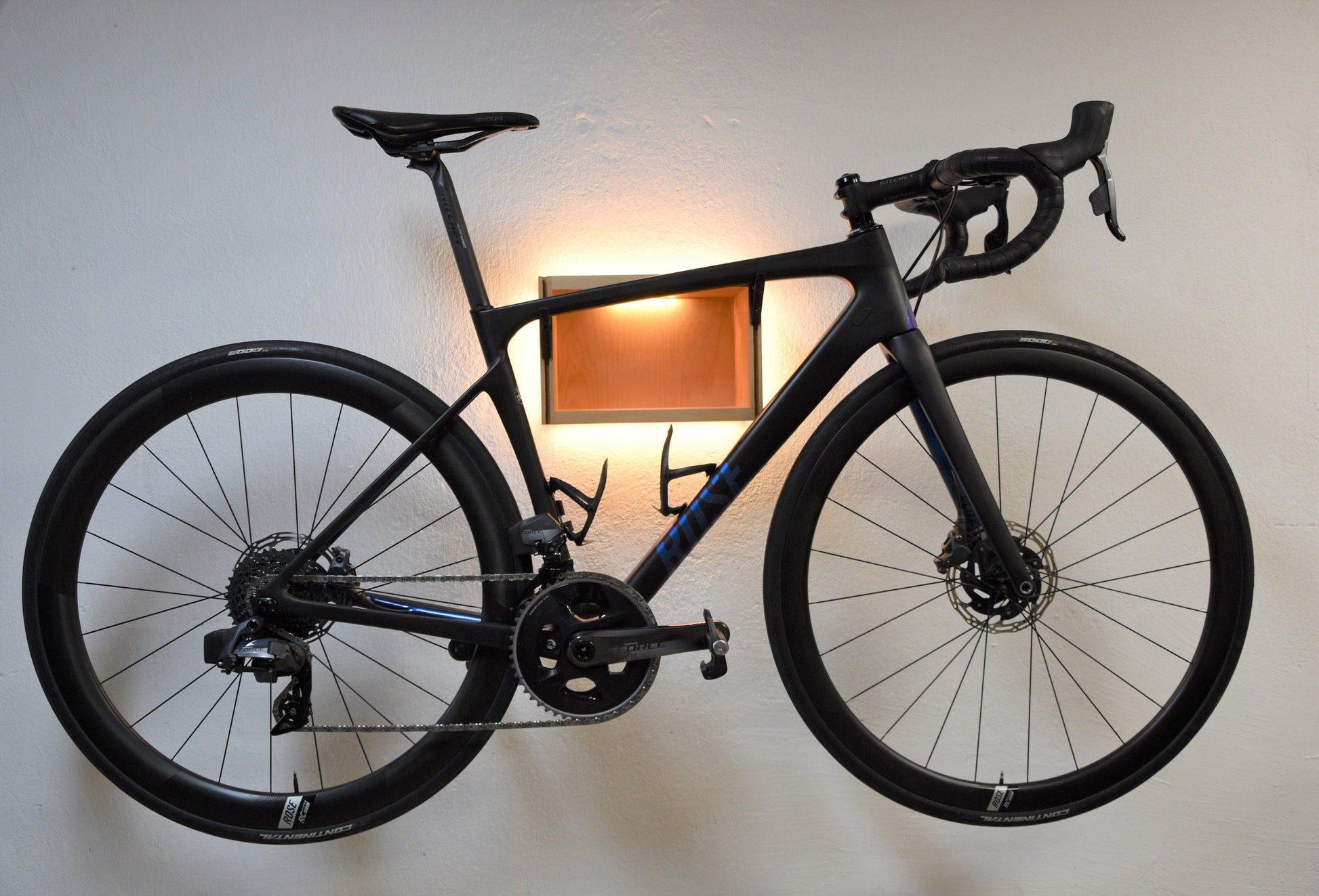 Handgefertigte, beleuchtete und einstellbare Wandhalterung für Fahrräder.