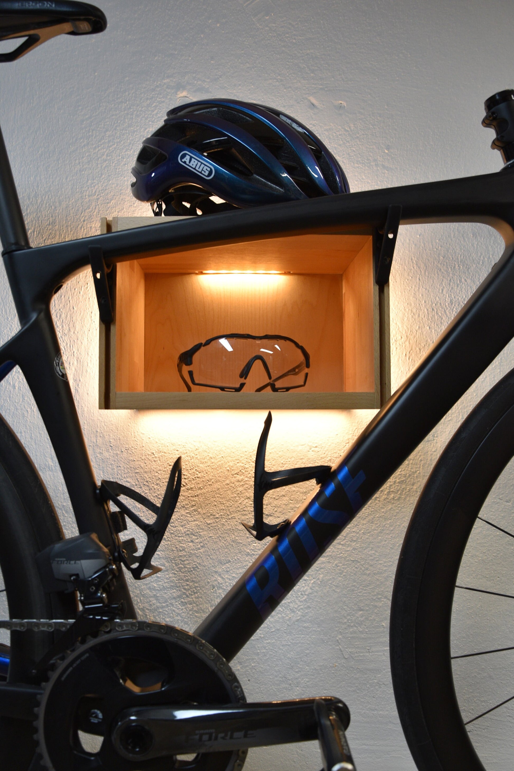 Fahrrad Wandhalterung: Handgefertigt, beleuchtet & flexibel einstellbar. Mit Vitrine für Zubehör. Wahlweise mit Netz- oder Batteriebetrieb.