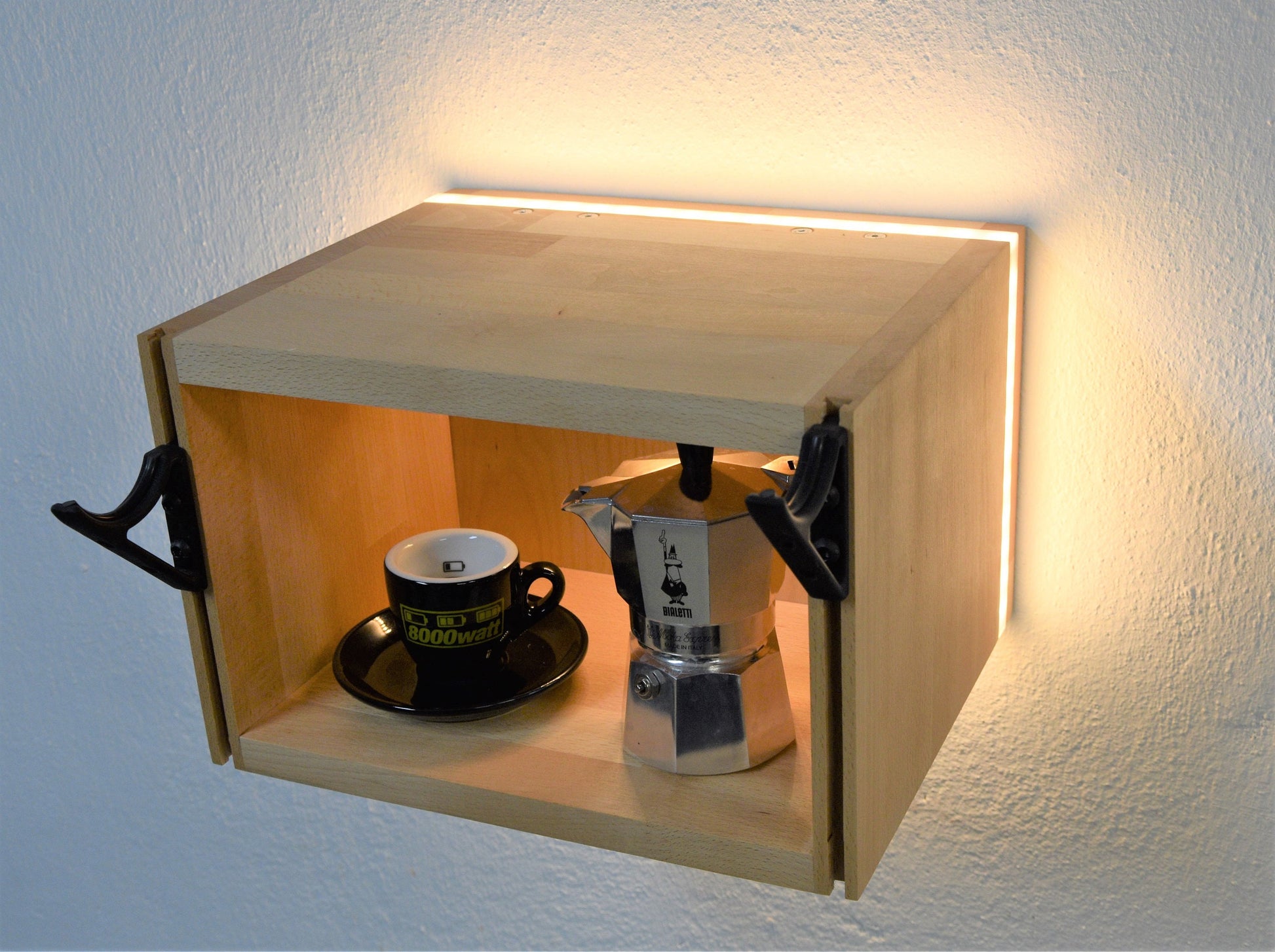 Der Korpus besteht aus geöltem Buchenholz. Die Halter sind im 3D-Druck-Verfahren SLA gefertigt.