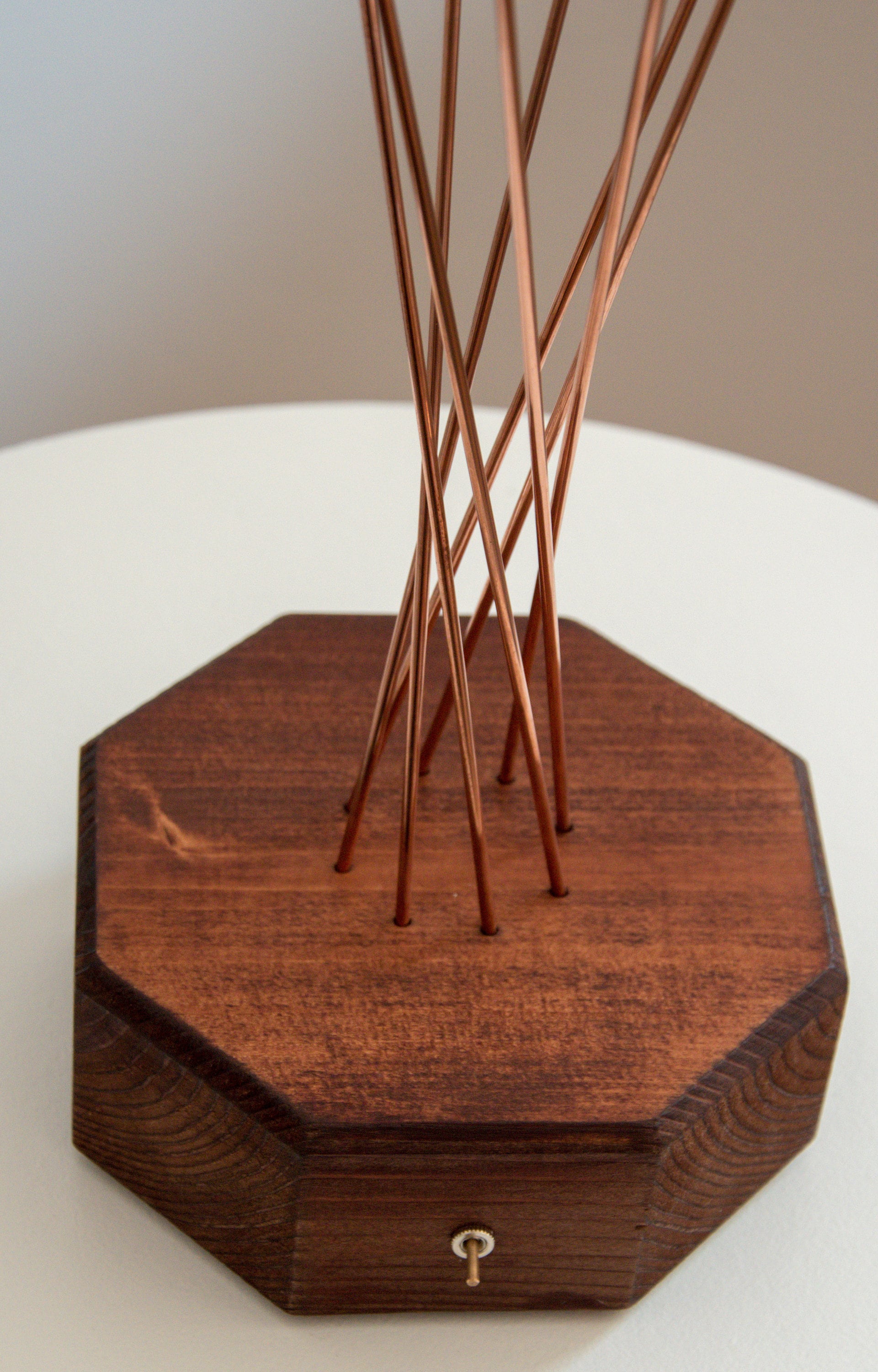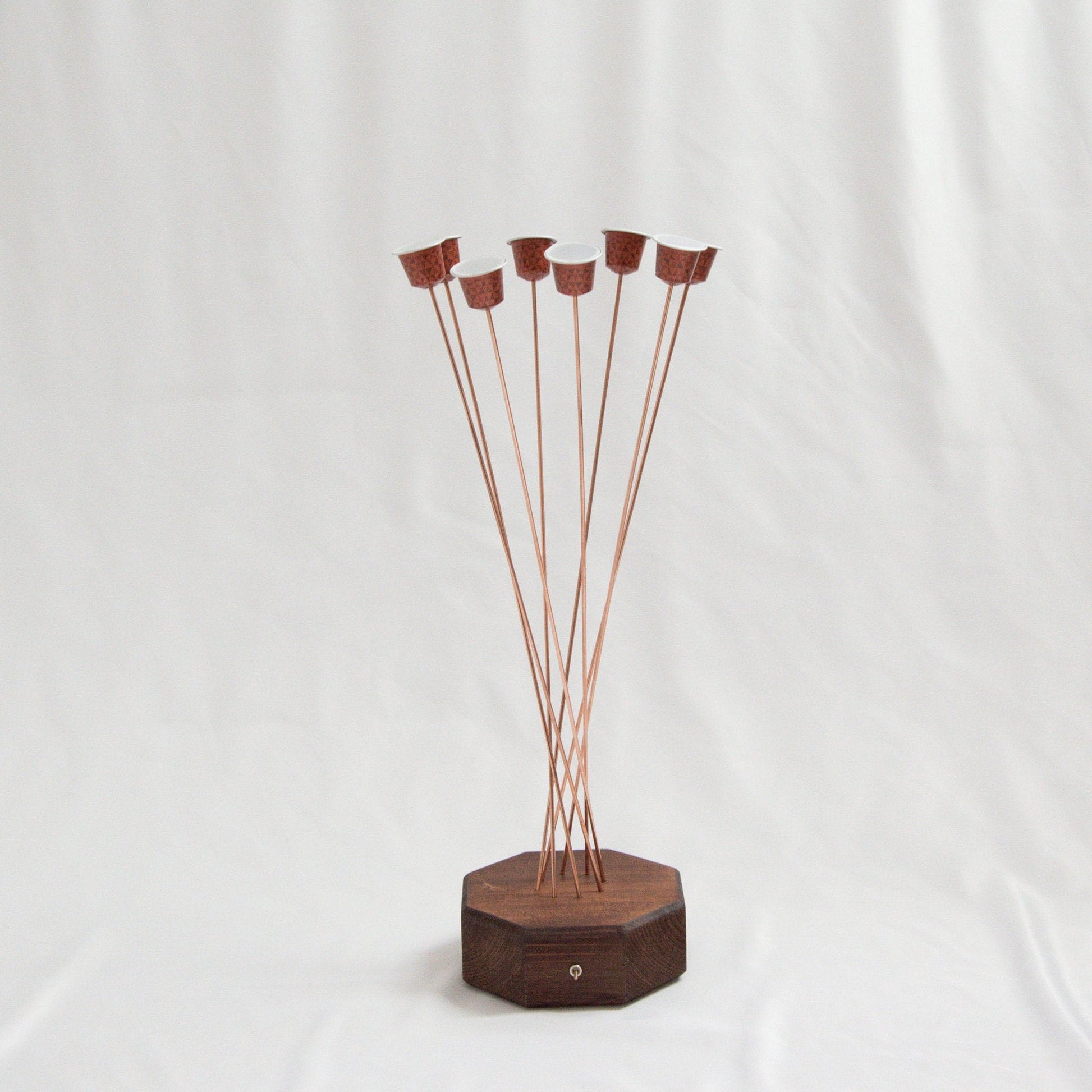 Handgefertigte Tischlampe mit acht Lampenschirmen aus Kaffee-Kapseln, die mit eleganten Stäben aus Kupfer mit einem achteckigen Holzfuß verbunden sind.