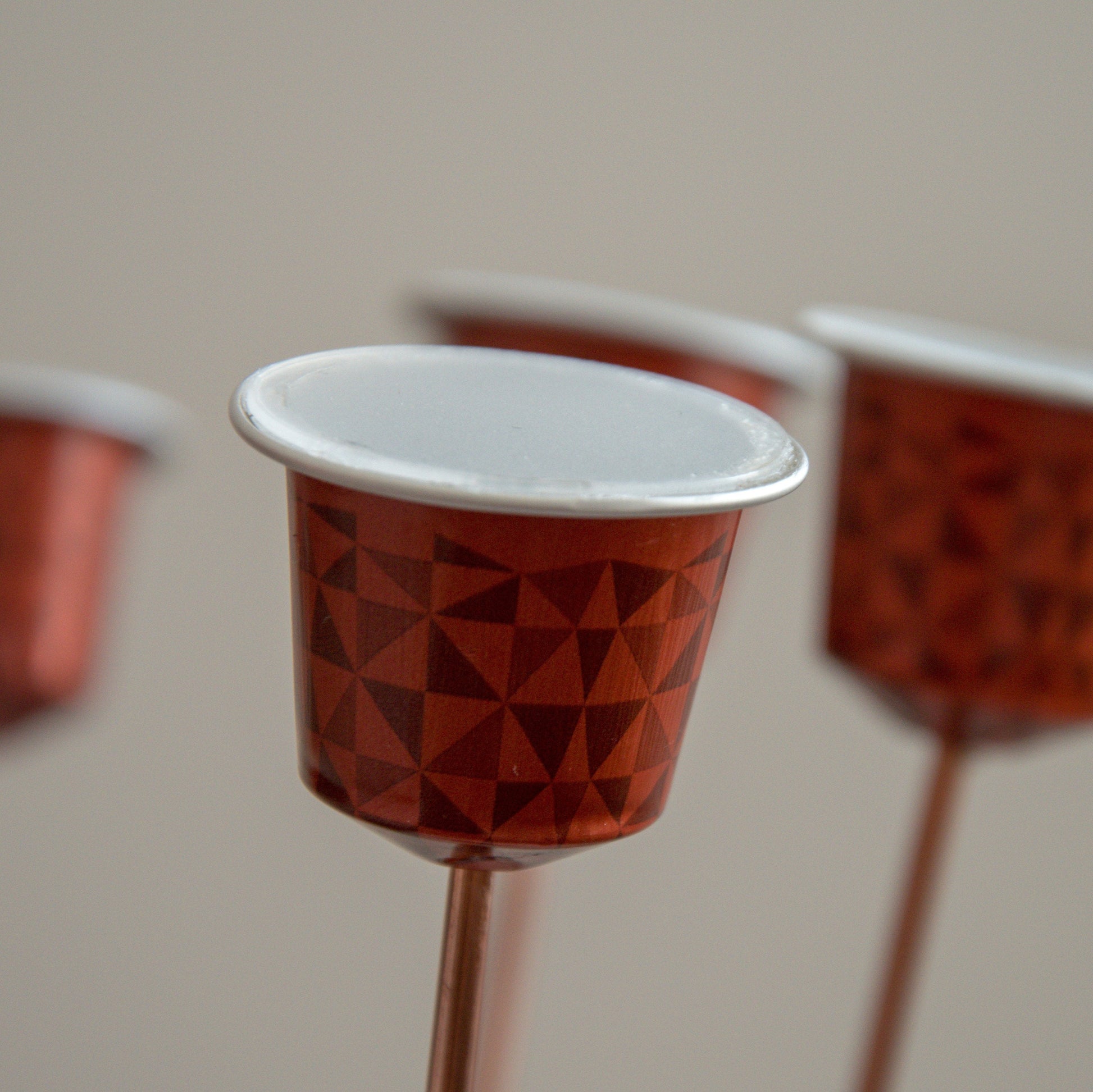 Die Leuchtkelche bestehen aus gereinigten upgecycelten Kaffee-Kapseln - die damit nicht auf dem Müll landen müssen, sondern ein zweites, langes Leben vor sich haben! Die Kapseln haben ein kupferbraunes Dreiecksmuster.
